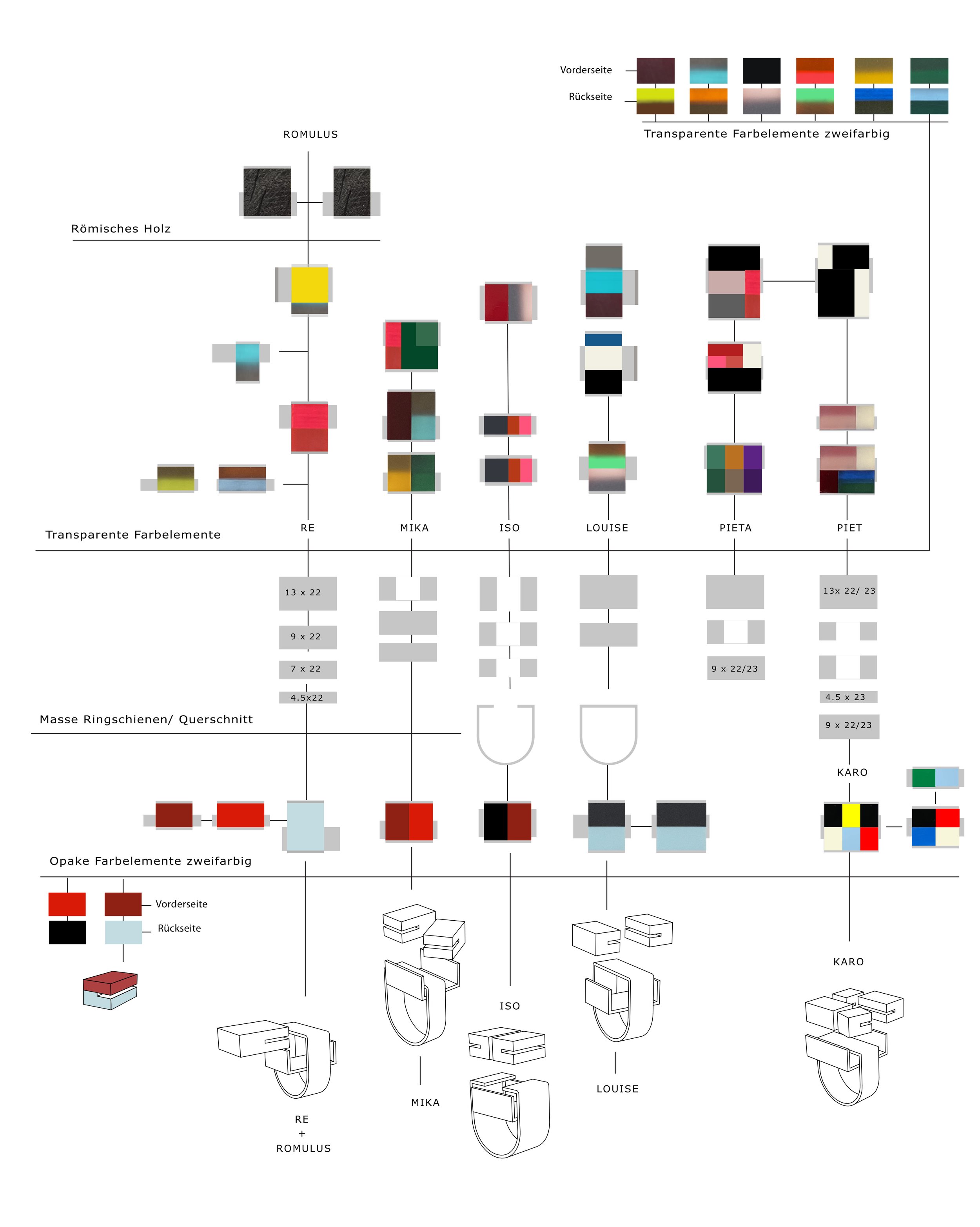 Farbwahl der transparenten Farbelemente. Die vorder- und rückseitig zweifarbigen sechs Farbelemente sind Aubergine/ Neongrün, Türkis/ Orange, Schwarz/ Rosa, Leuchtrot/ Froschgrün, Gelb/ Nachtblau, Dunkelgrün/ Himmelblau.